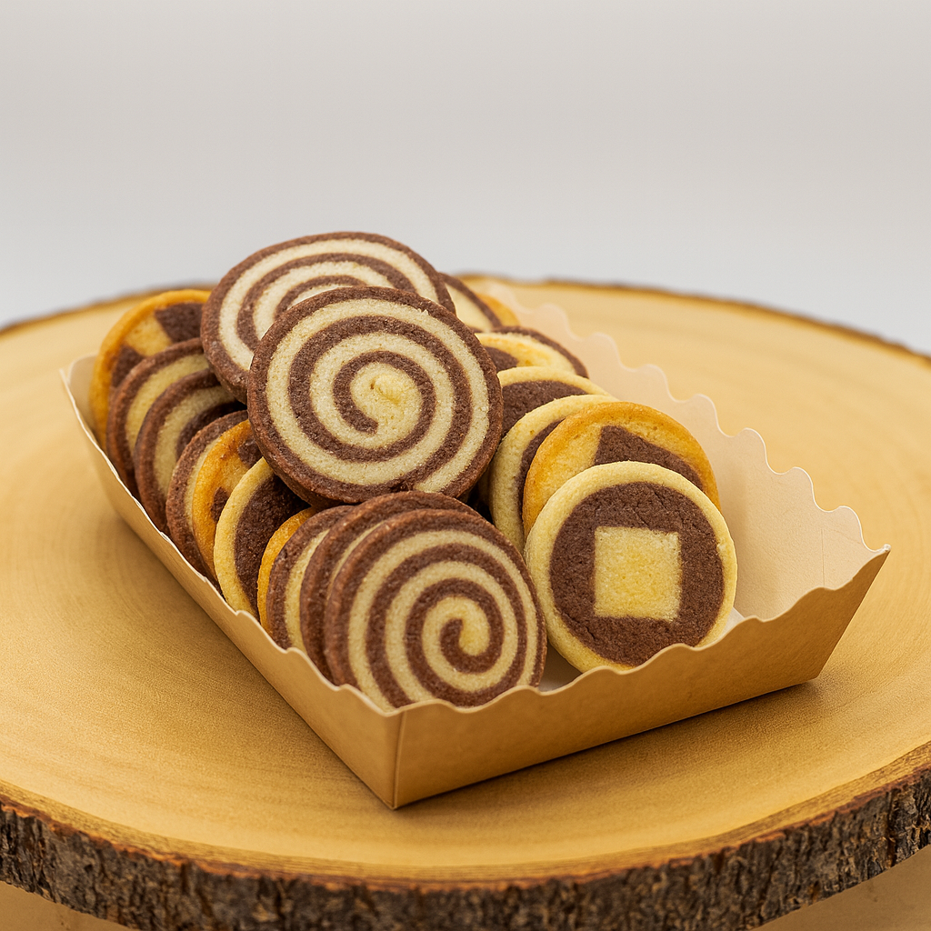 Unsere Schwarz-Weiß Teegebäckvariationen sind ein wahres Geschmackserlebnis. Diese zarten Kekse kombinieren geschickt die süße Versuchung von Vanille mit der verlockenden Bitterkeit von Schokolade.